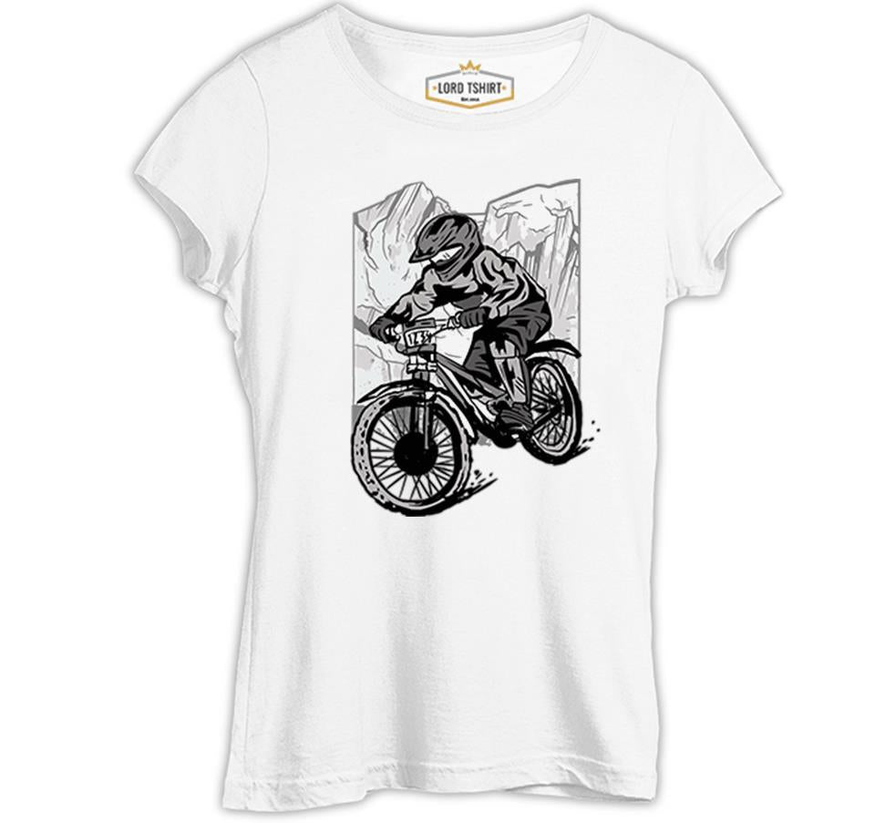 A Biker Riding in Front of the Mountains Beyaz Kadın Tshirt