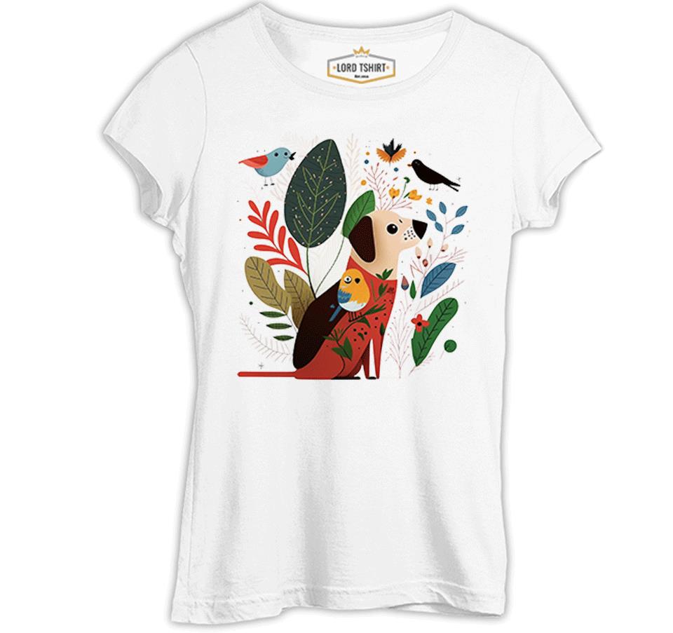 A Dog and Birds with Spring Background Beyaz Kadın Tshirt