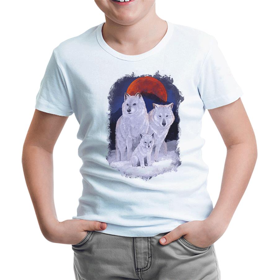 A Wolf Family in front of a Red Moon Scene Beyaz Çocuk Tshirt