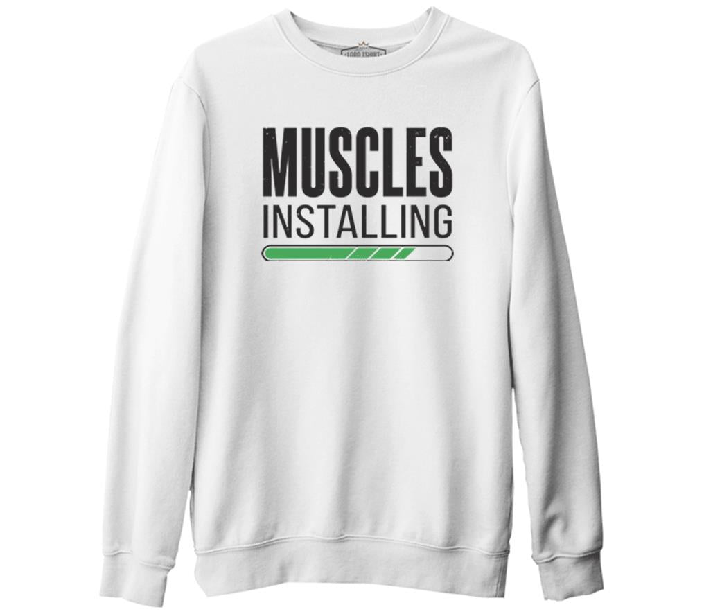 Bodybuilding Muscles Installing Beyaz Erkek Kalın Sweatshirt