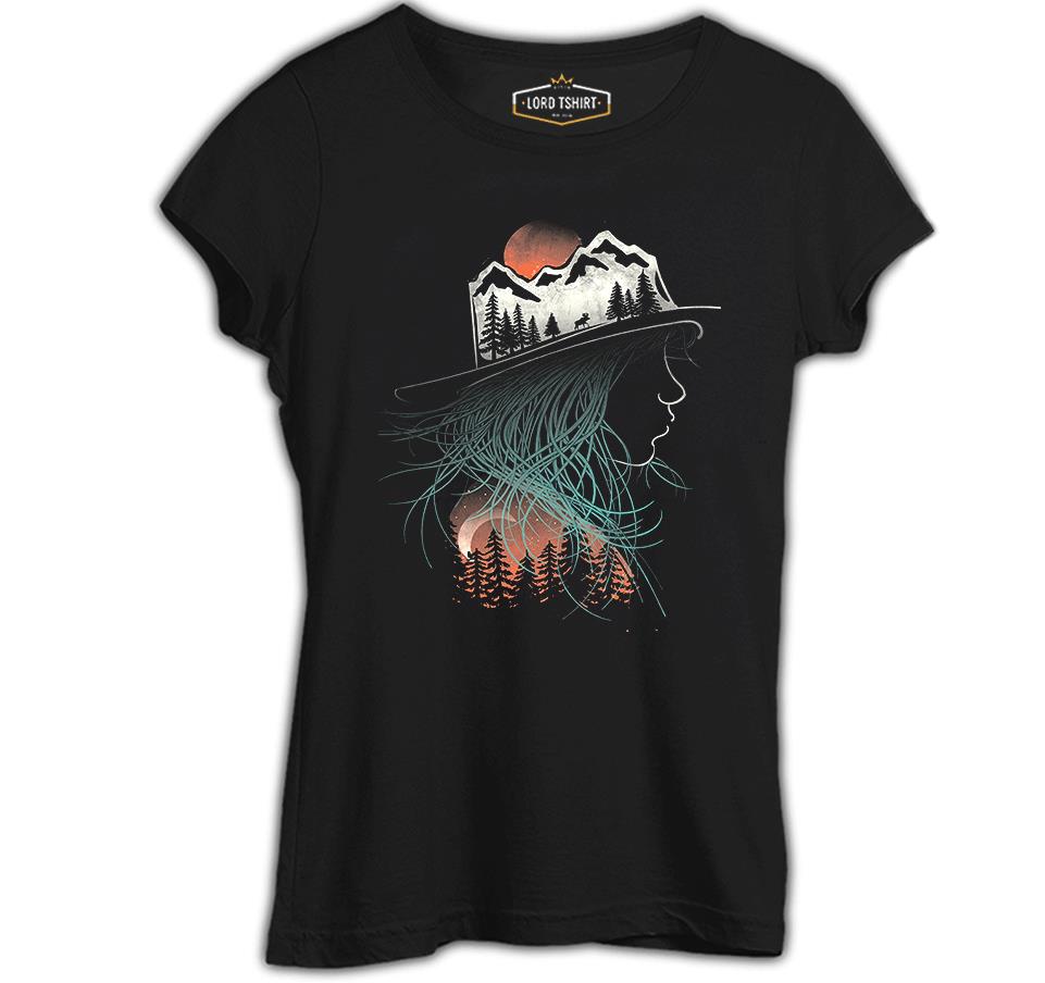 Doğa Macera Kamp Silüet Siyah Kadın Tshirt
