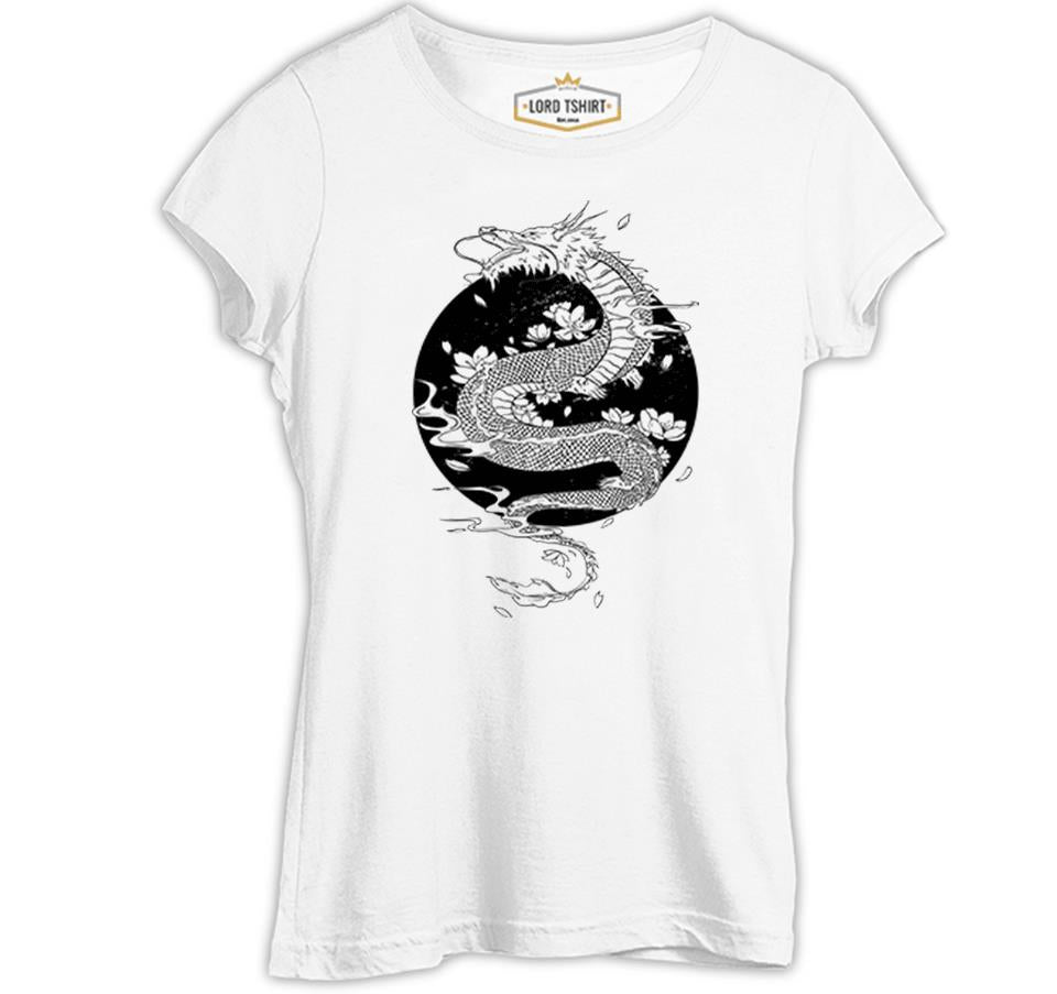 Dragon with Moon and Flowers Beyaz Kadın Tshirt