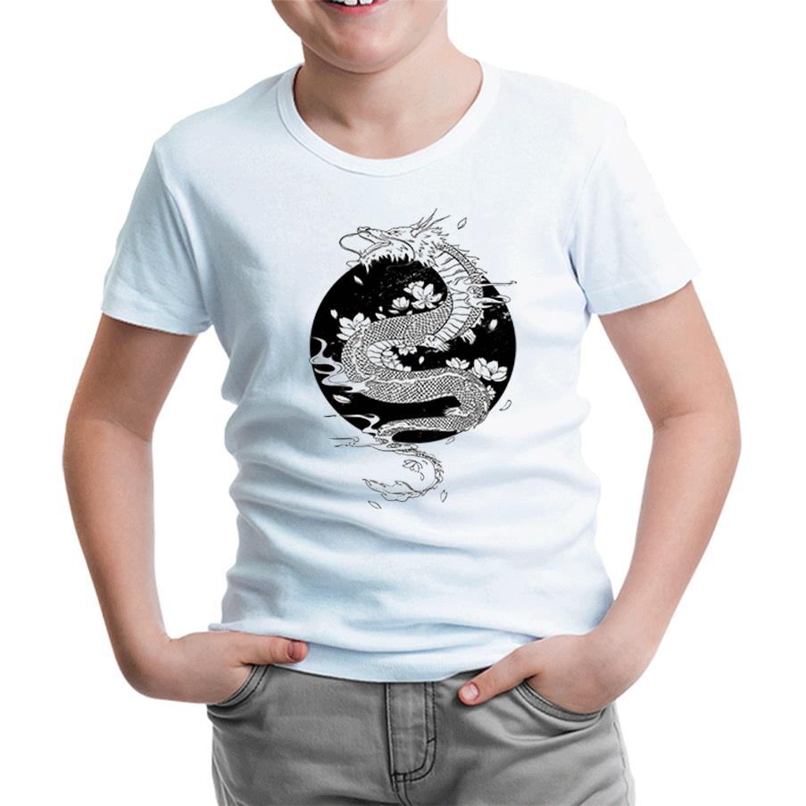 Dragon with Moon and Flowers Beyaz Çocuk Tshirt
