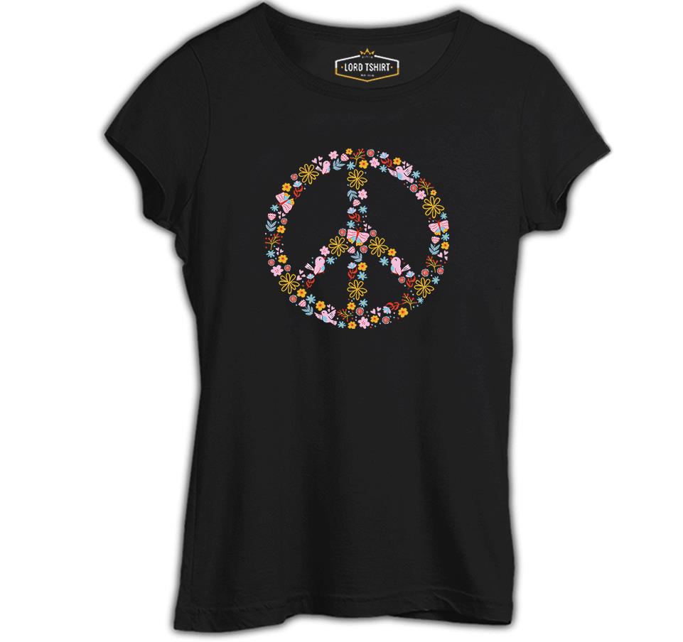 Floral Butterfly Birds Peace Symbol Siyah Kadın Tshirt
