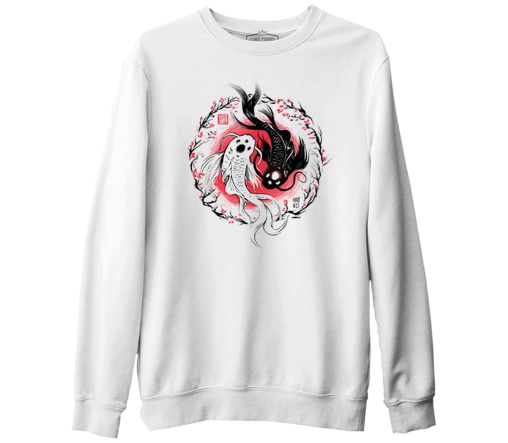Koi Fishes in a Floral Circle Beyaz Erkek Kalın Sweatshirt