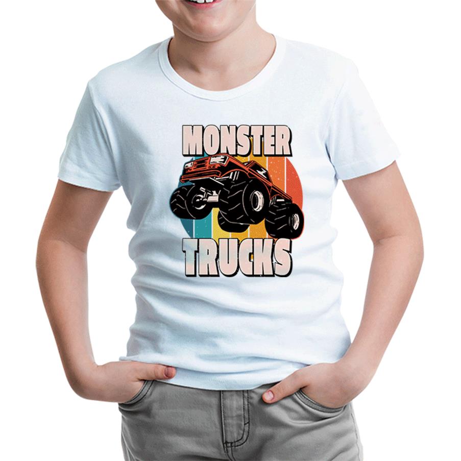 Monster Trucks Circle Sunset Background Beyaz Çocuk Tshirt