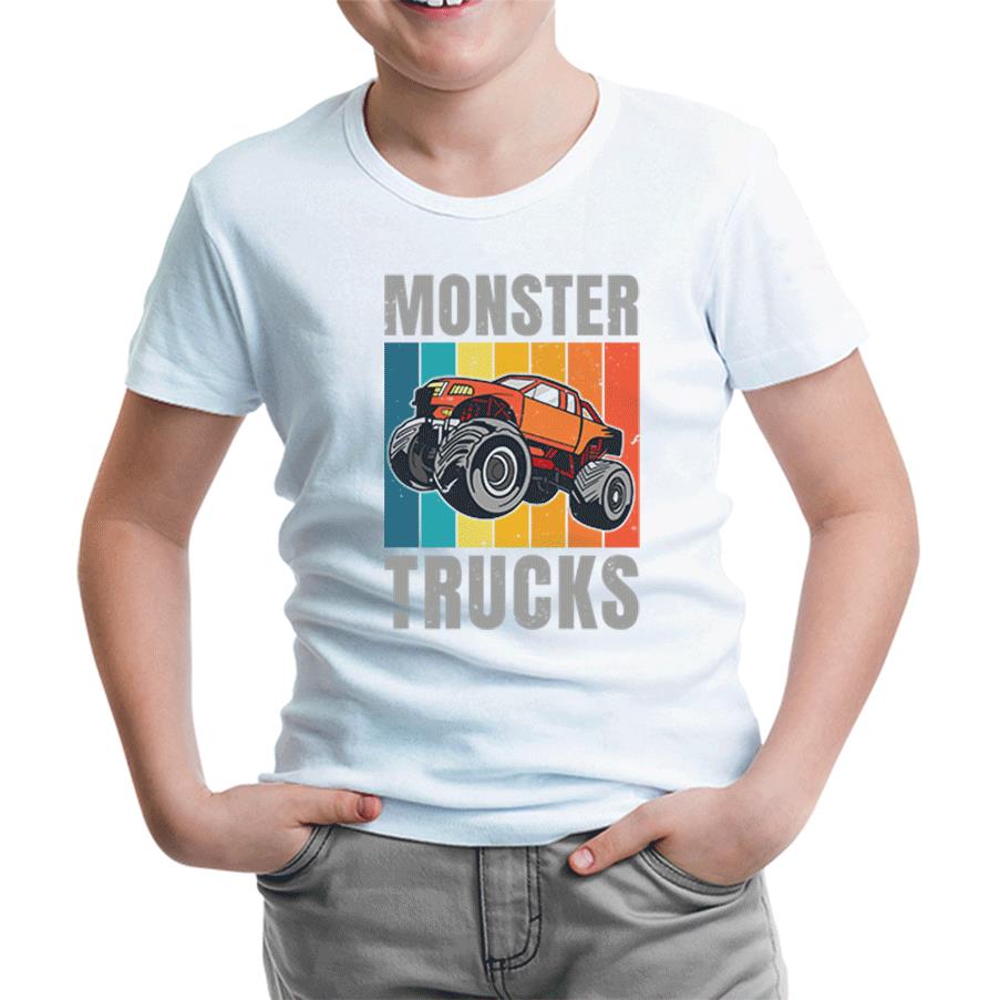 Monster Trucks wit Retro Background Beyaz Çocuk Tshirt