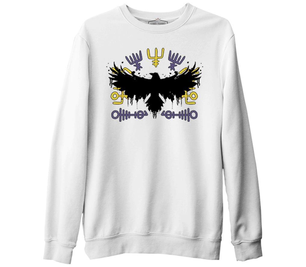 Raven Silhouette with Viking Symbols Beyaz Erkek Kalın Sweatshirt