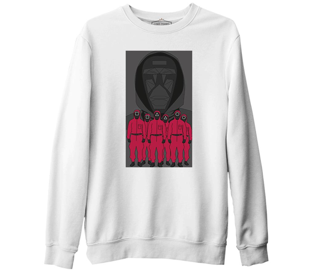 Squid Game - Maske Gri ve Askerler Beyaz Erkek Kalın Sweatshirt