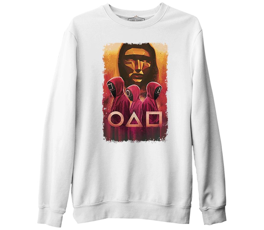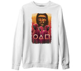Squid Game - Maske Sarı ve Askerler Beyaz Erkek Kalın Sweatshirt