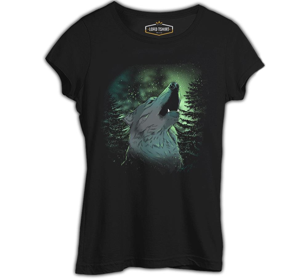 Wolf Howling in a Green Light Forest Siyah Kadın Tshirt